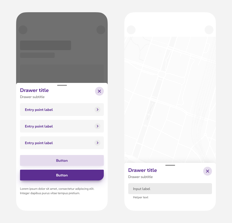 - The anatomy of a drawer allows subflows to feel more comfortable, while making it clear that the user has not left the parent page. In other terms, it is preffered to use drawers for the completion of subflows. And overlayers to communicate critical information that can be acted upon or dismissed.