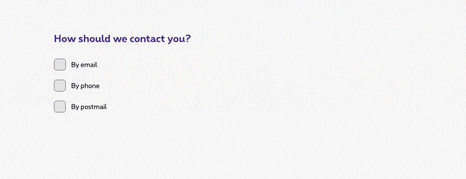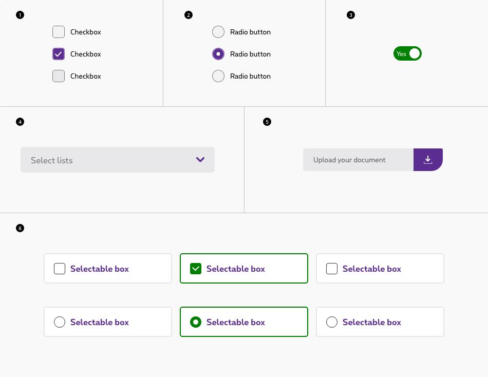 | 6. Selectable boxes | To select a single or multiple items from a list. | Choose a plan, an option, etc. |