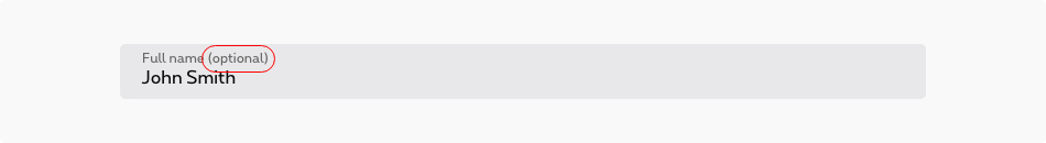 All fields in a form are assumed required, with optional fields being tagged as so in the label. Although advise avoiding an excess of optional fields, if the situation arises, we recommend devoting an entire section to optional fields to avoid excessive repetition.