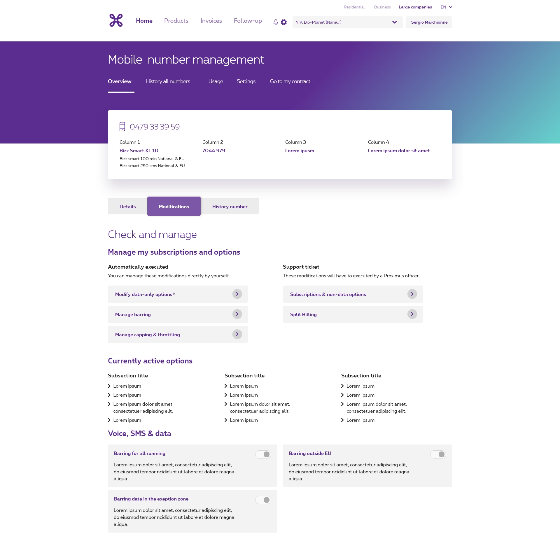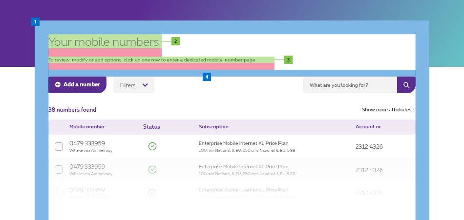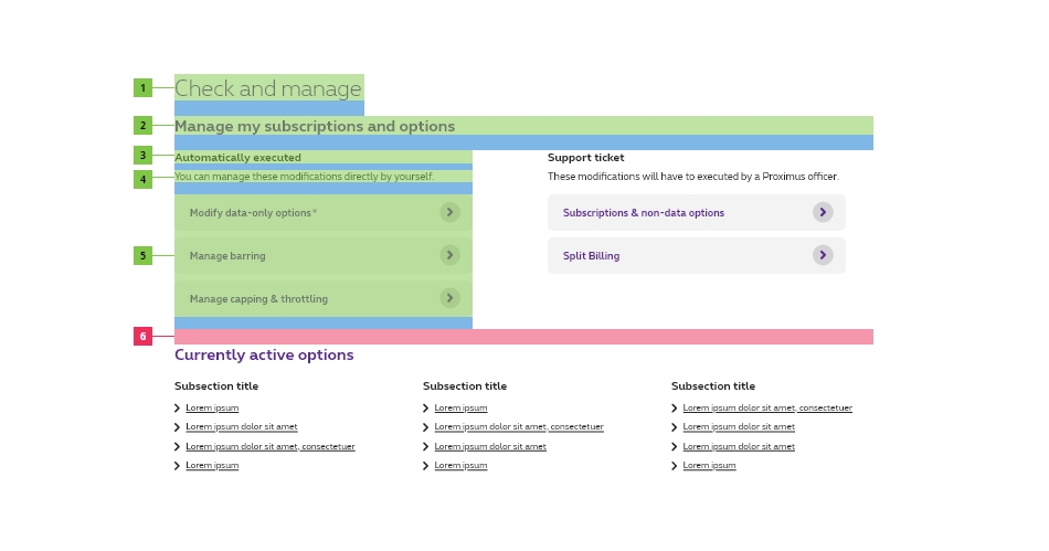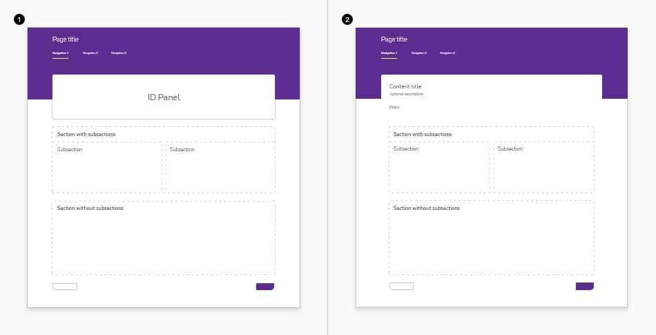The designer can decide what the content of these (sub)sections are depending on the page. The content will often be composed of design elements from the design system. Varying from data tables, panel, entrypoints, list of links, and more components.