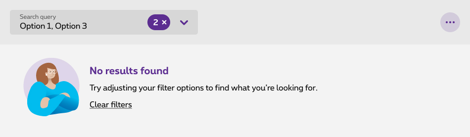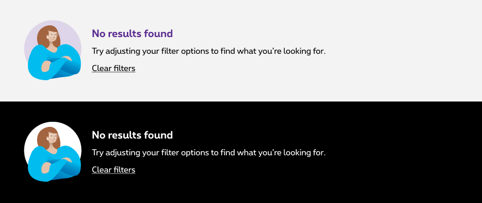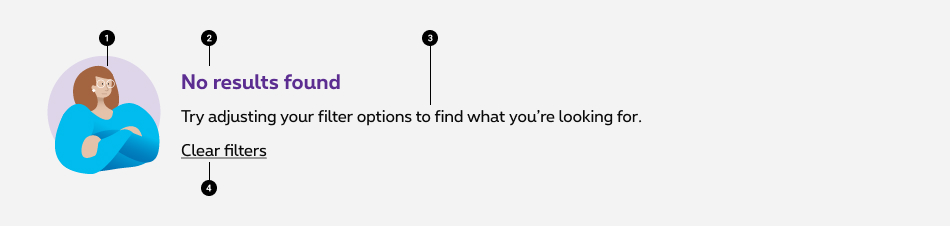 A short and concise explanation. When possible, try to write a positive and actionable statement. In this example, "Try updating your filters" feels more actionable than "Your search didn't return any results". - Description
